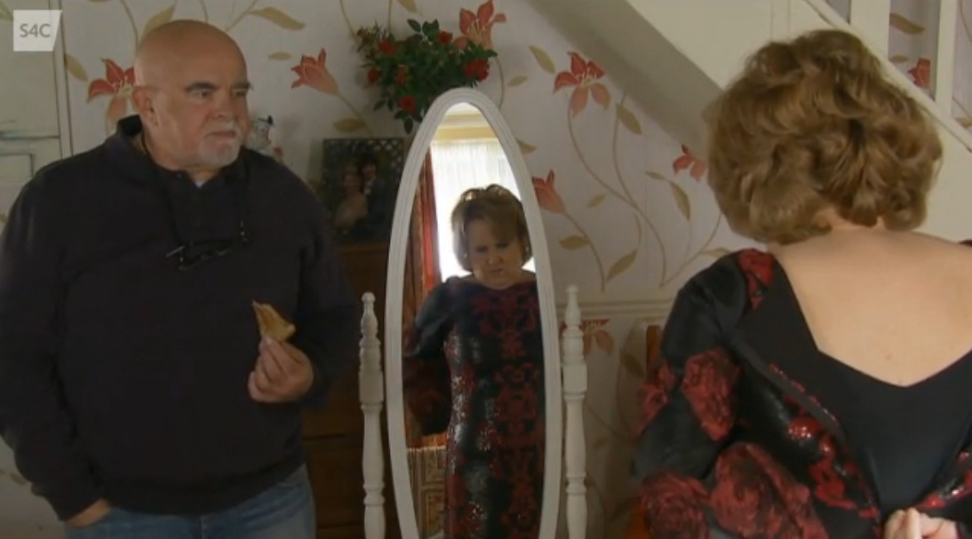 At Bryntirion, Diane is having problems doing up the zip on the dress she wants to wear to the wedding. “Do you think I’ve put on weight?” she asks Dai, but he declines to answer. “No food for me until after the wedding – I’ll fit into this dress, if it kills me!” she promises.
